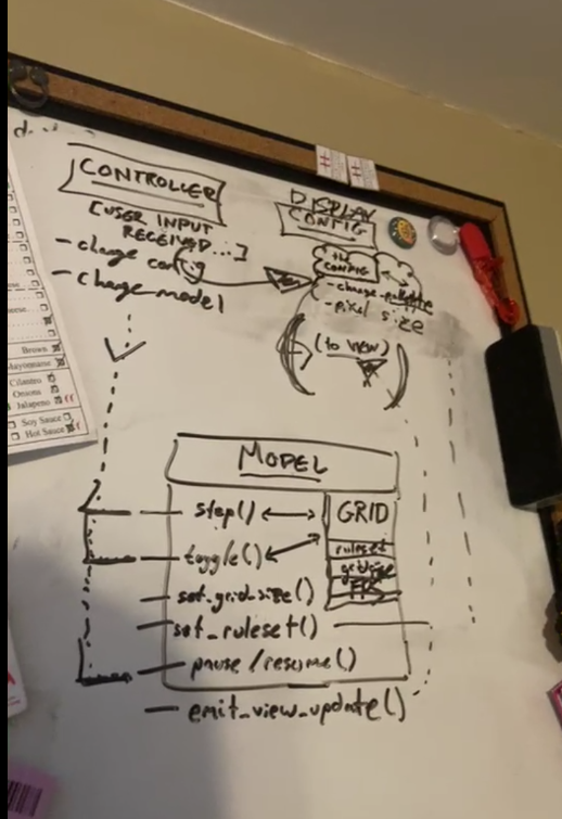 The implementation had a Grid that handled all the logic of the automata and the Grid had a viewer attached to it. The idea was that whenever the grid had a change in state that it would notify its viewer to render the grid.